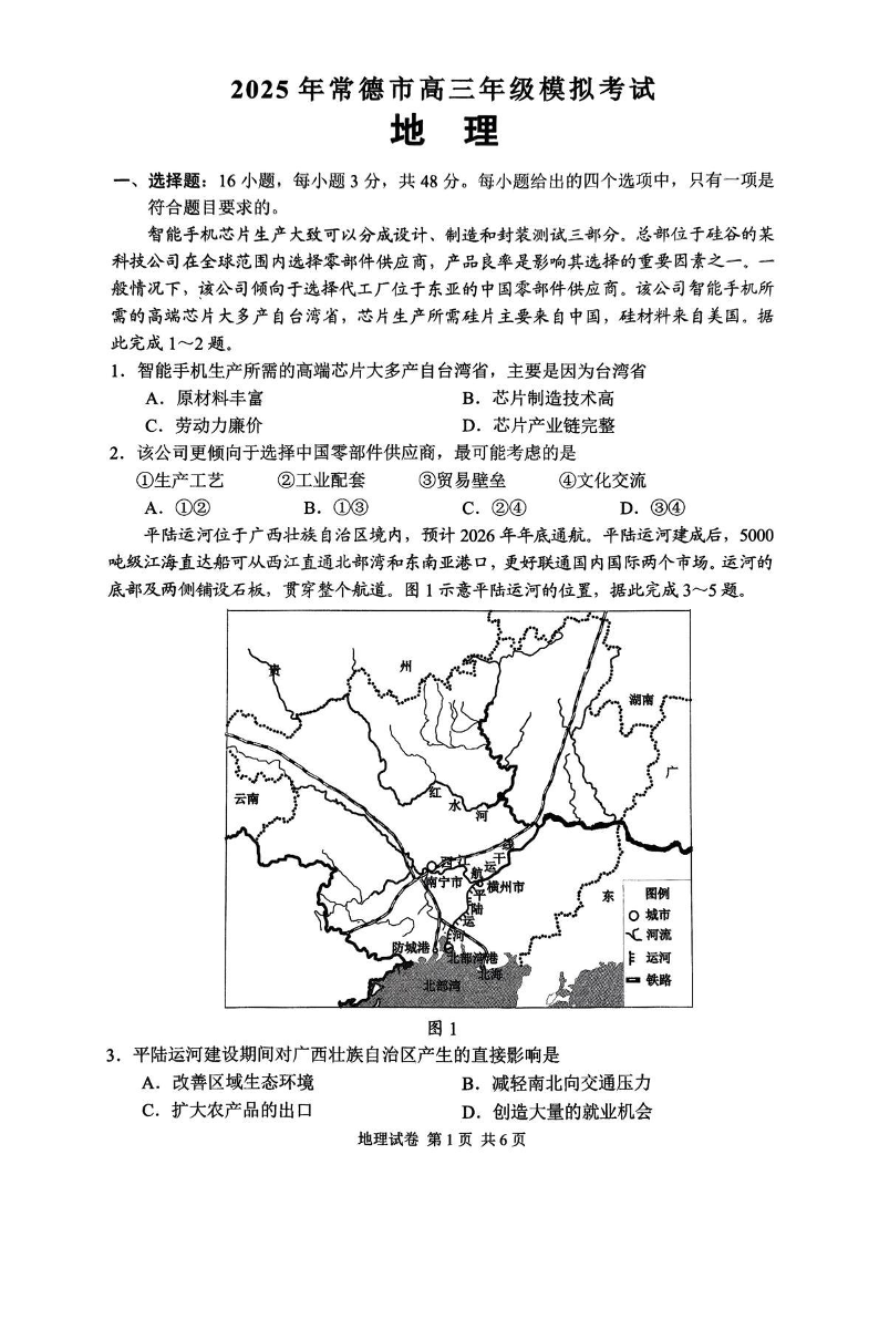 湖南省2025年常德市高三年级模拟考试(二模)地理(含答案).pdf