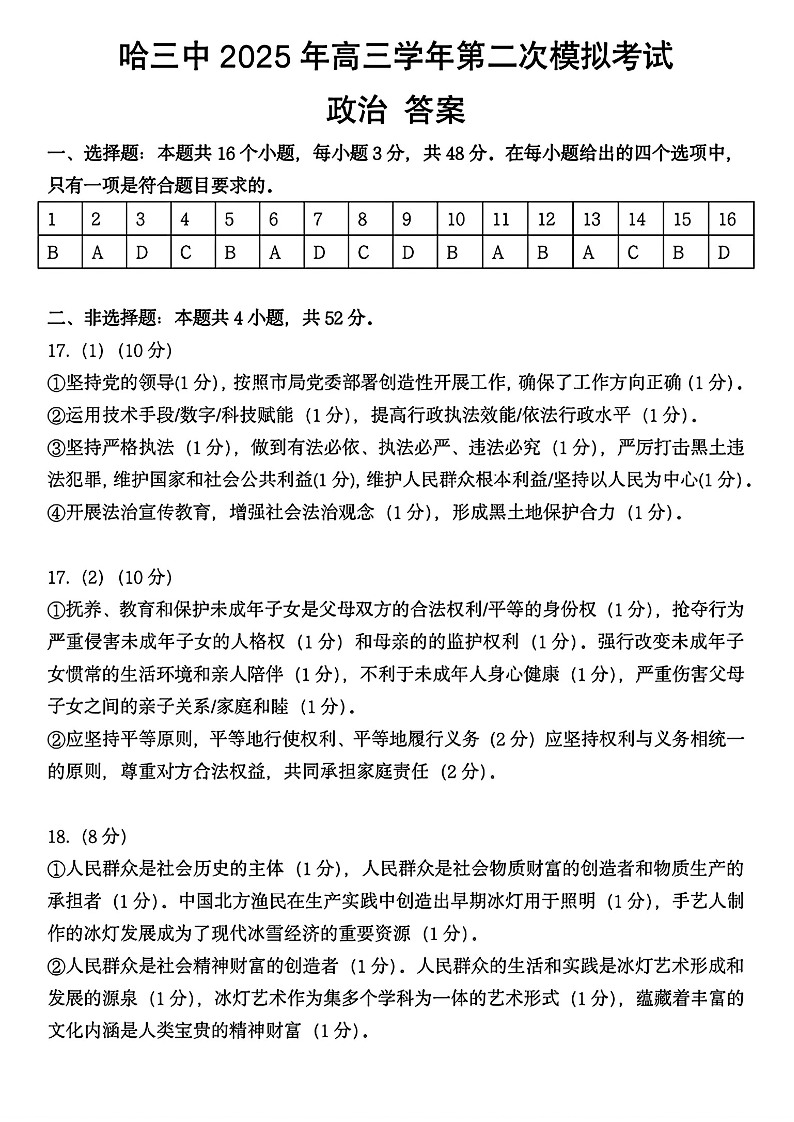 哈三中2025年高三学年第二次模拟考试 政治答案.pdf