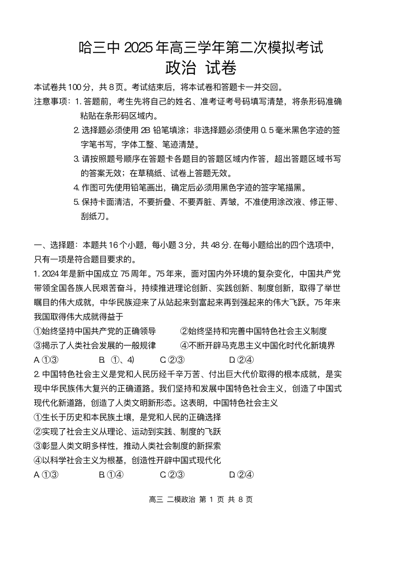 哈三中2025年高三学年第二次模拟考试 政治.pdf