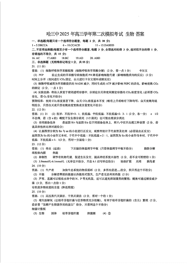 哈三中2025年高三学年第二次模拟考试 生物答案.pdf