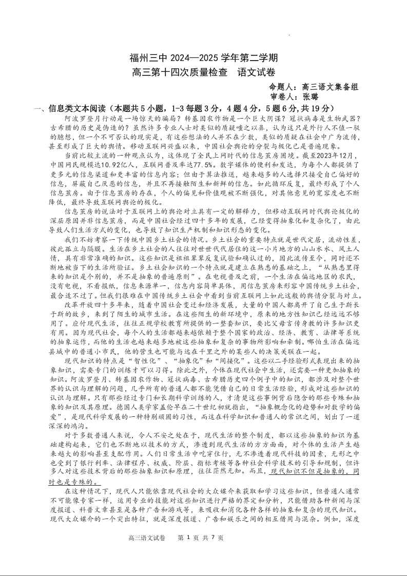 福州三中2024-2025 学年第二学期高三第十四次质量检测 语文.docx