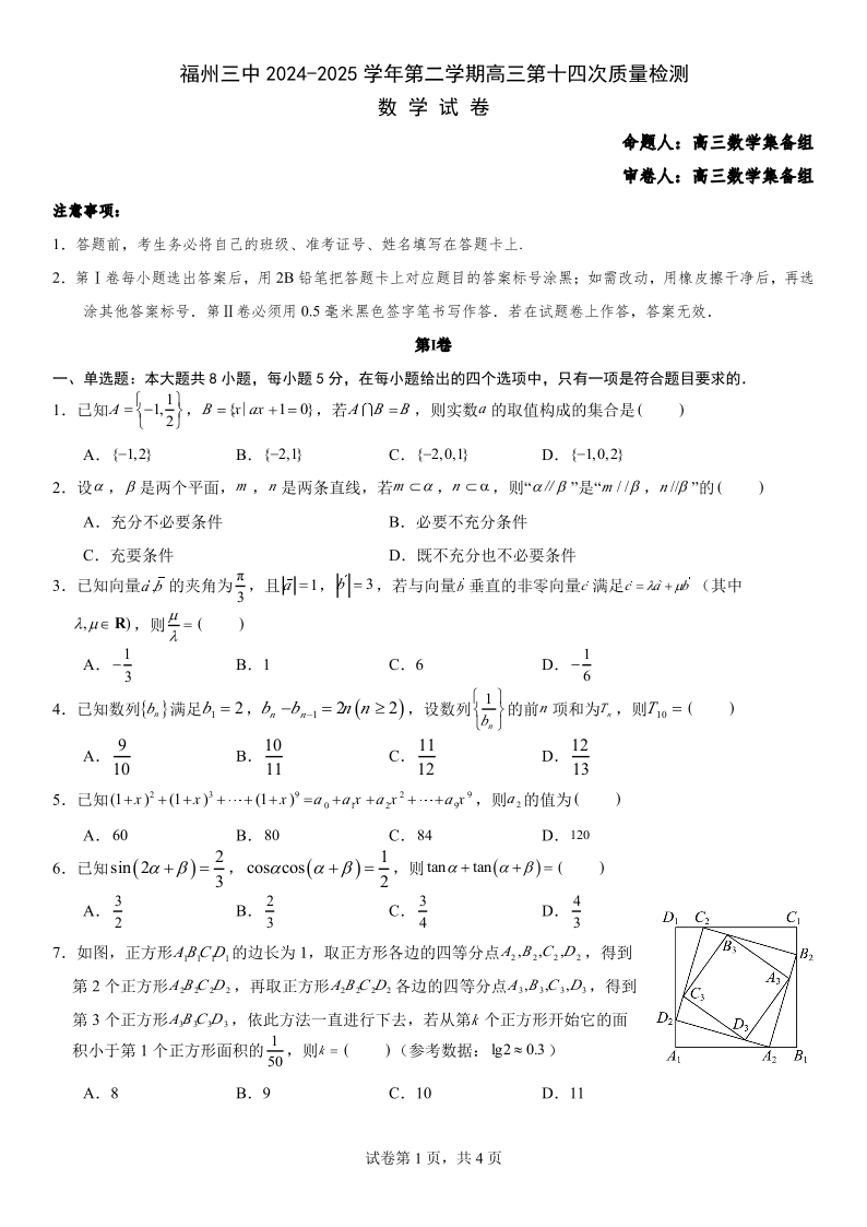 福州三中2024-2025 学年第二学期高三第十四次质量检测 数学.pdf
