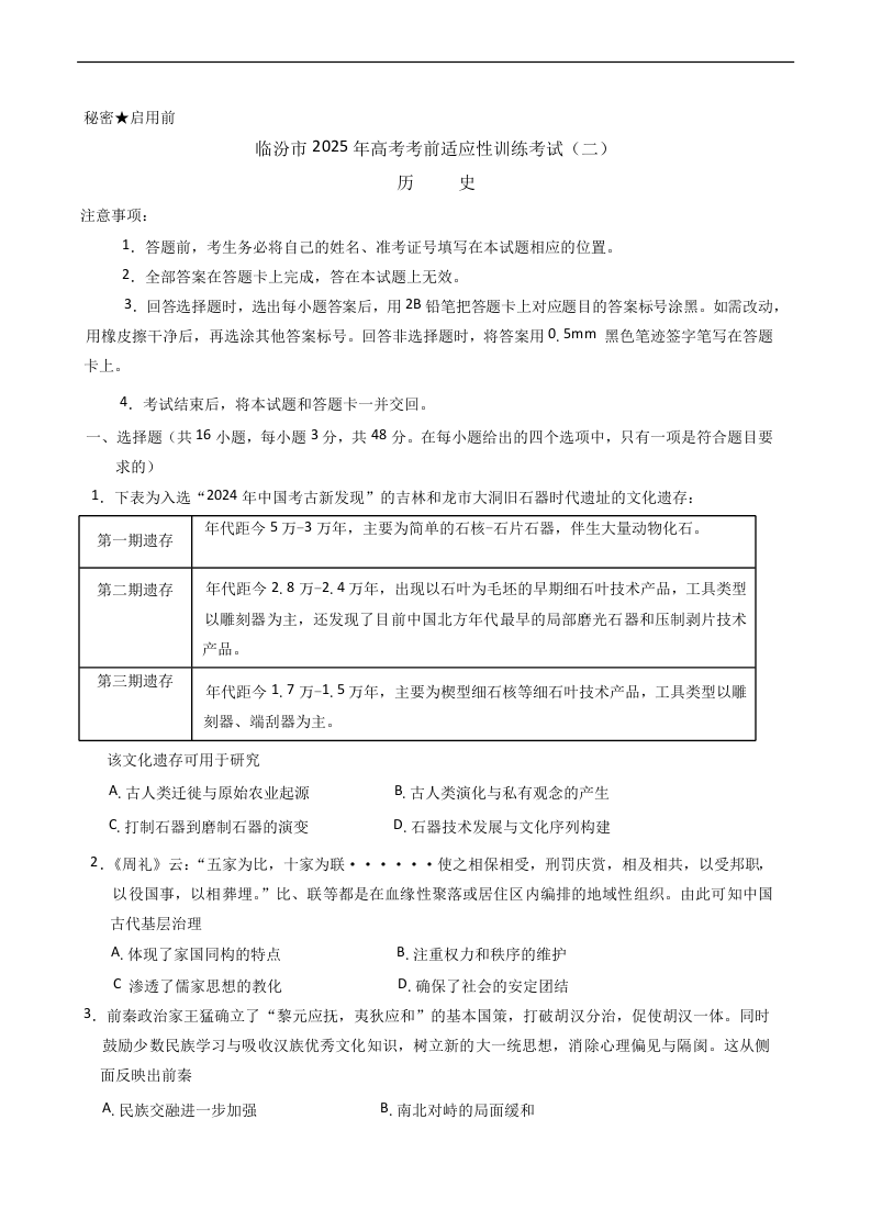 山西省临汾市2025年高考考前适应性训练考试(二)历史(含答案).docx