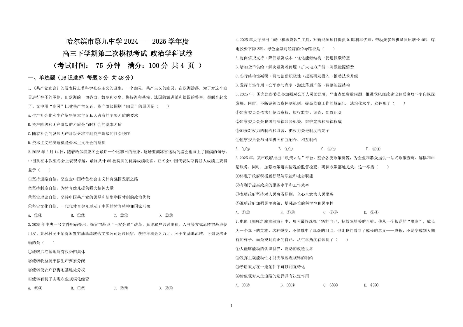 哈尔滨市第九中学校2025届高三下学期第二次模拟考试 政治(含答案).pdf