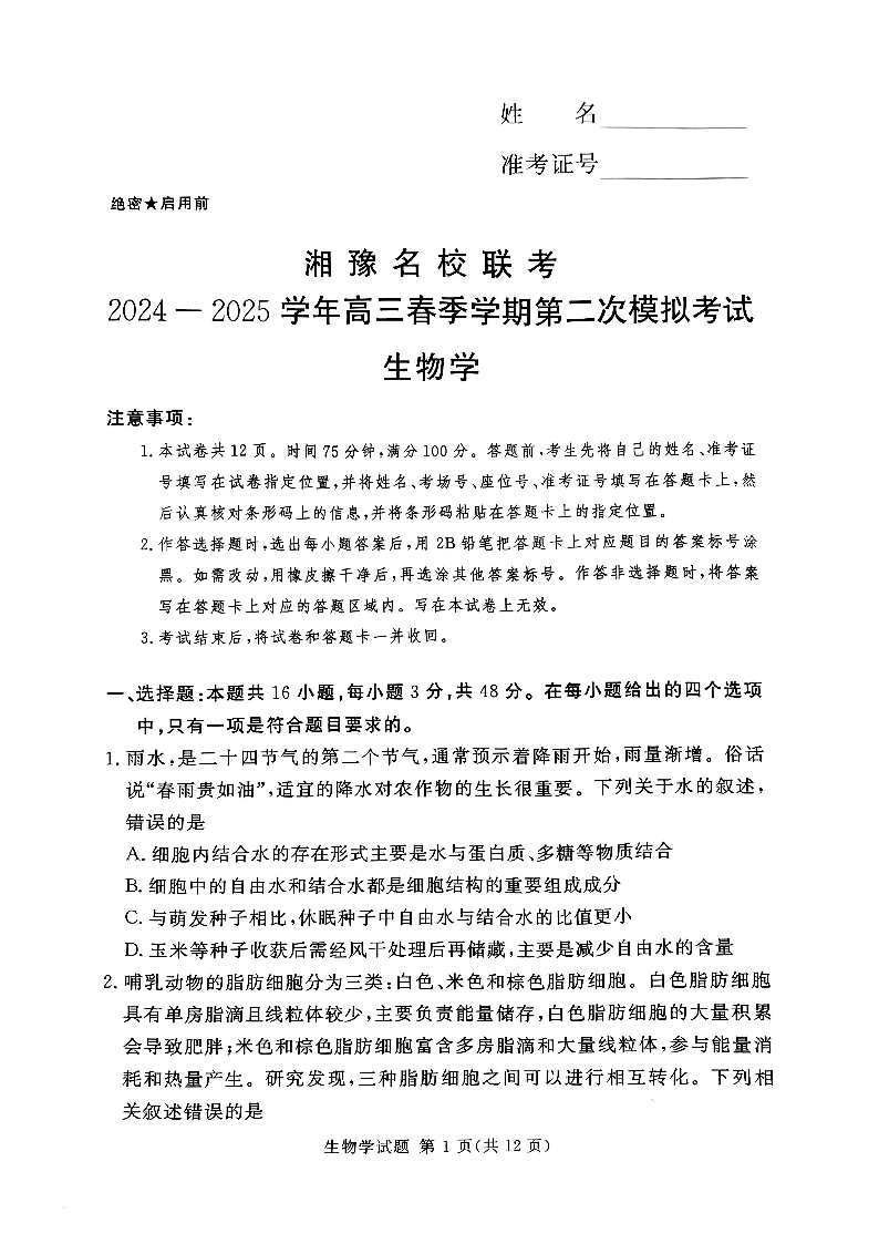 湘豫名校联考2024-2025学年高三春季学期第二次模拟考试 生物.pdf