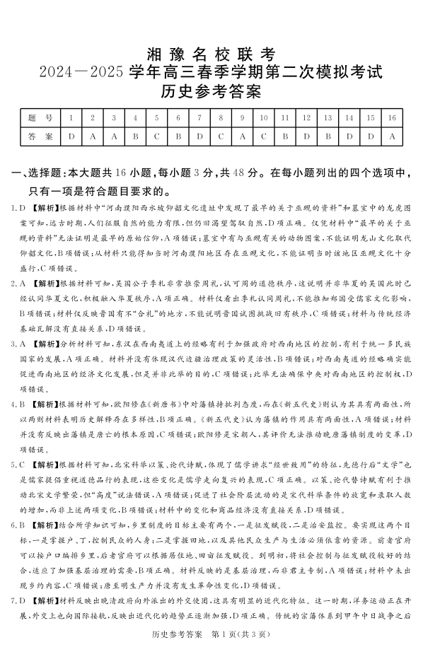 湘豫名校联考2024-2025学年高三春季学期第二次模拟考试 历史答案.pdf