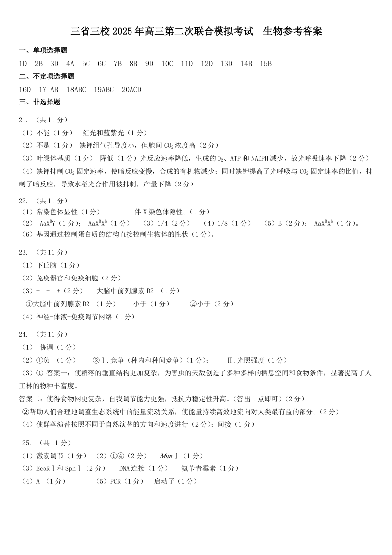 东北三省三校2025届高三下学期第二次联合模拟考试 生物答案.docx
