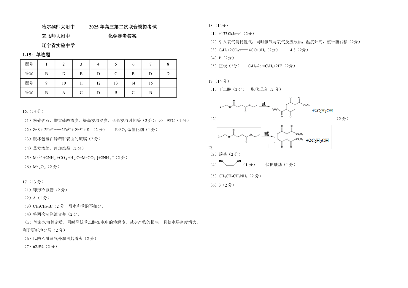 东北三省三校2025届高三下学期第二次联合模拟考试 化学答案.docx