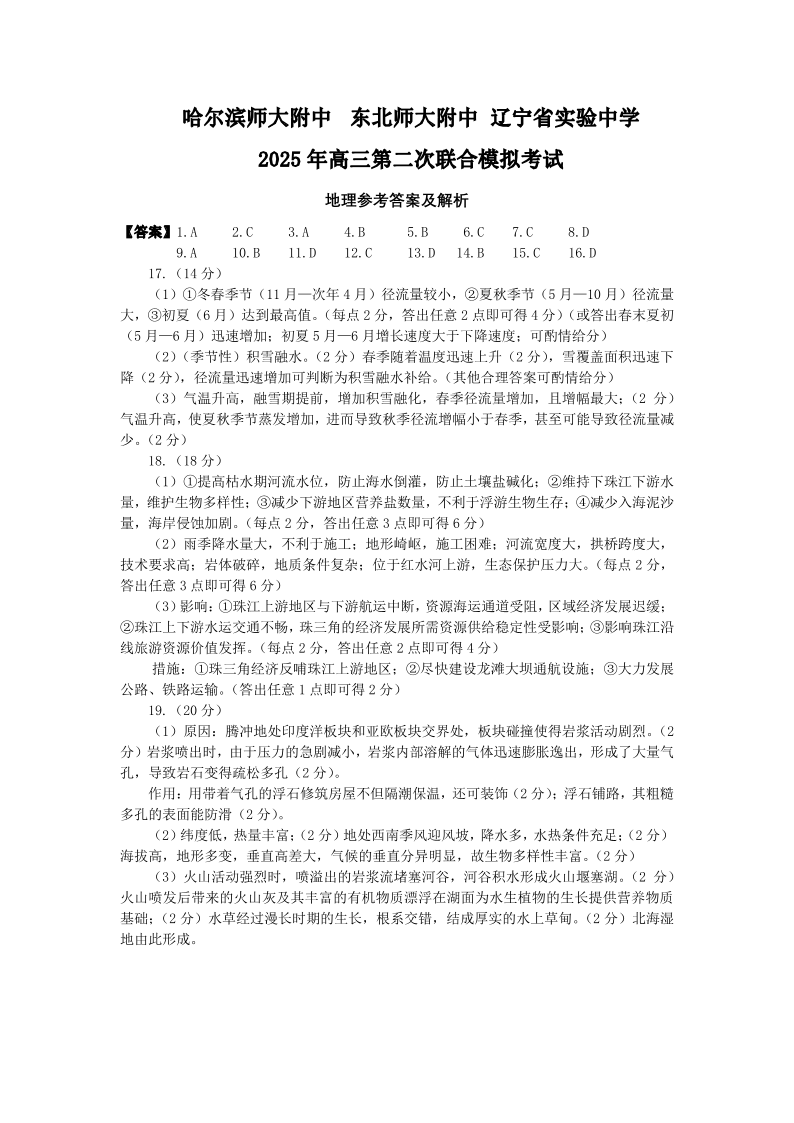 东北三省三校2025届高三下学期第二次联合模拟考试 地理答案.pdf