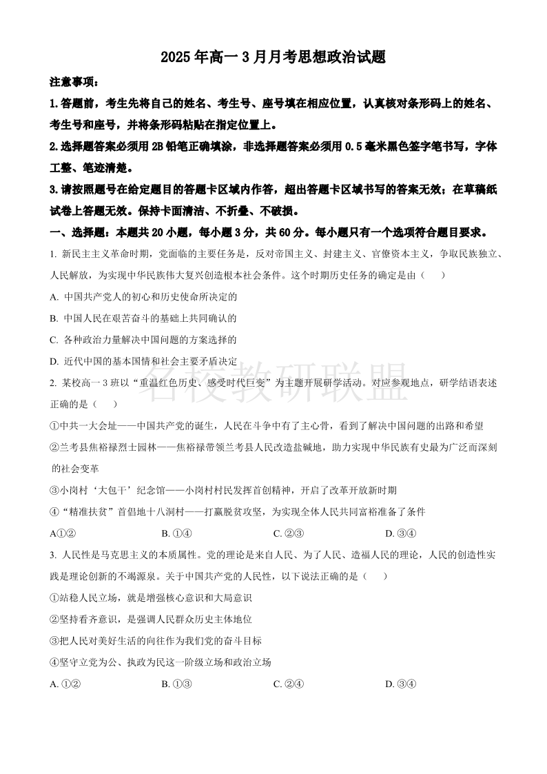 山东省济宁市第一中学2025年高一3月份月考 政治.pdf