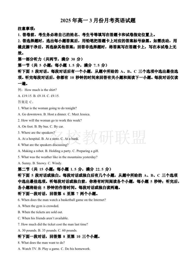山东省济宁市第一中学2025年高一3月份月考 英语.pdf