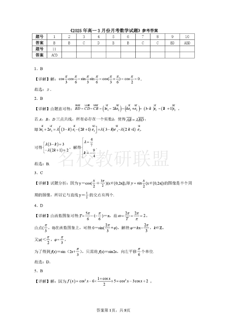 山东省济宁市第一中学2025年高一3月份月考 数学答案.pdf
