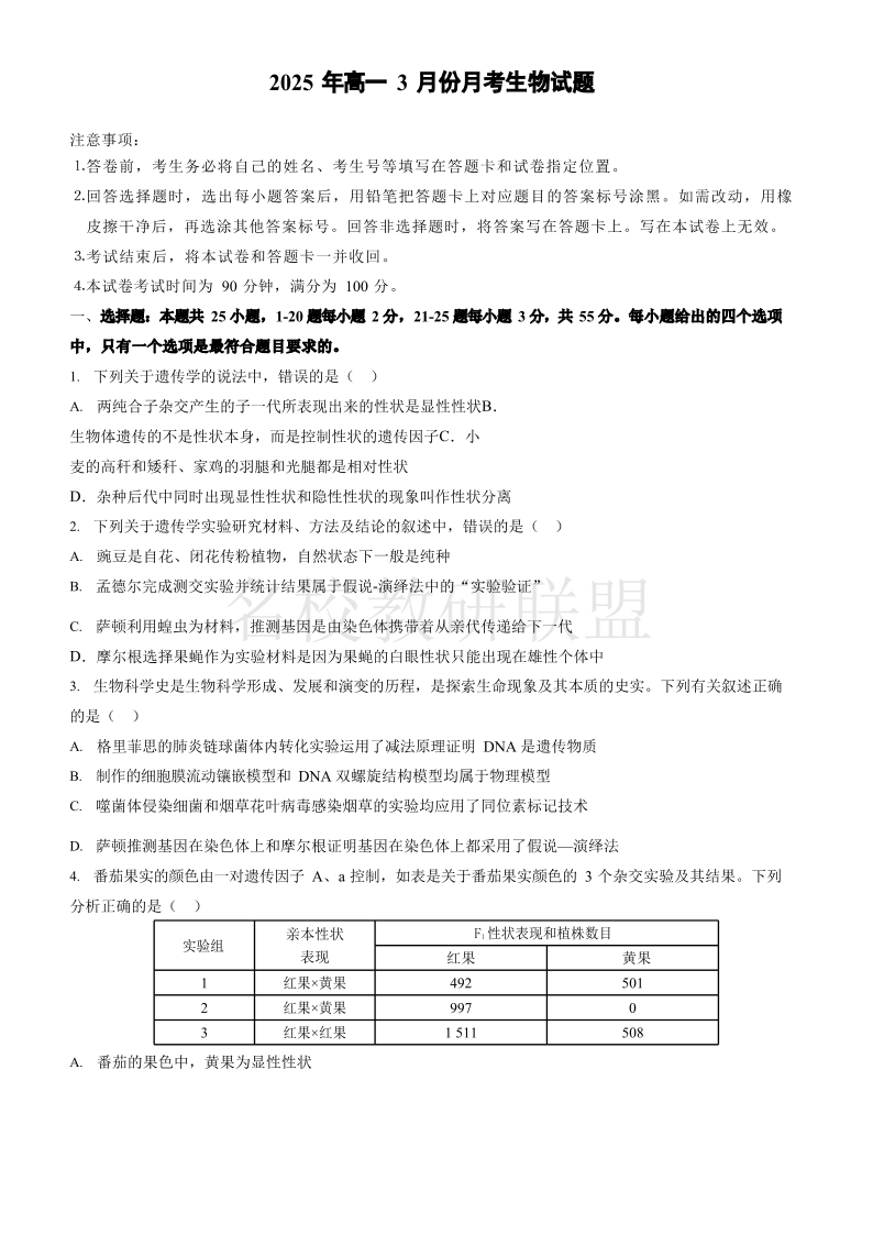 山东省济宁市第一中学2025年高一3月份月考 生物.pdf