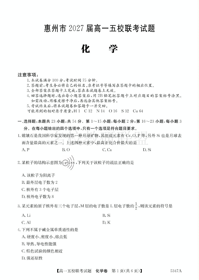 广东省惠州市2027届高一五校联考 化学(含答案).pdf