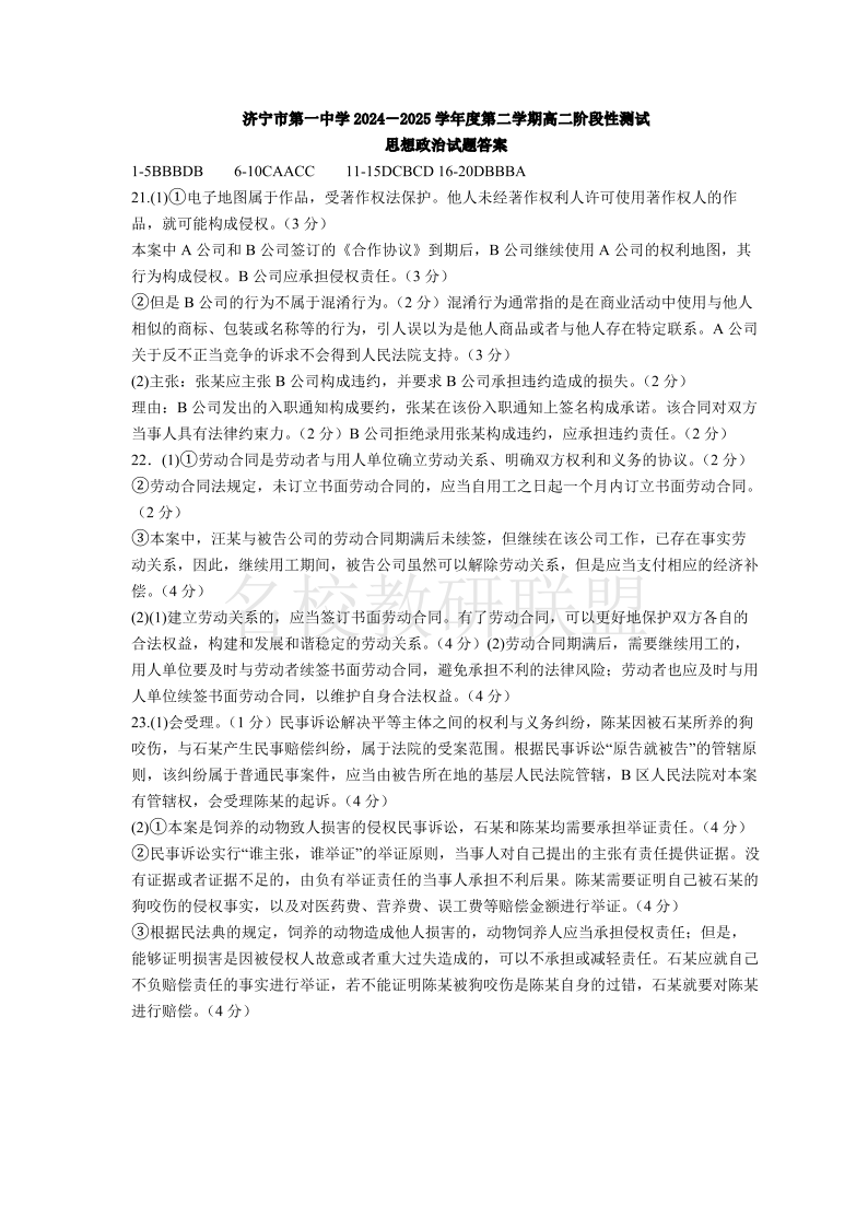山东省济宁市第一中学2025年高二3月份月考 政治答案.pdf