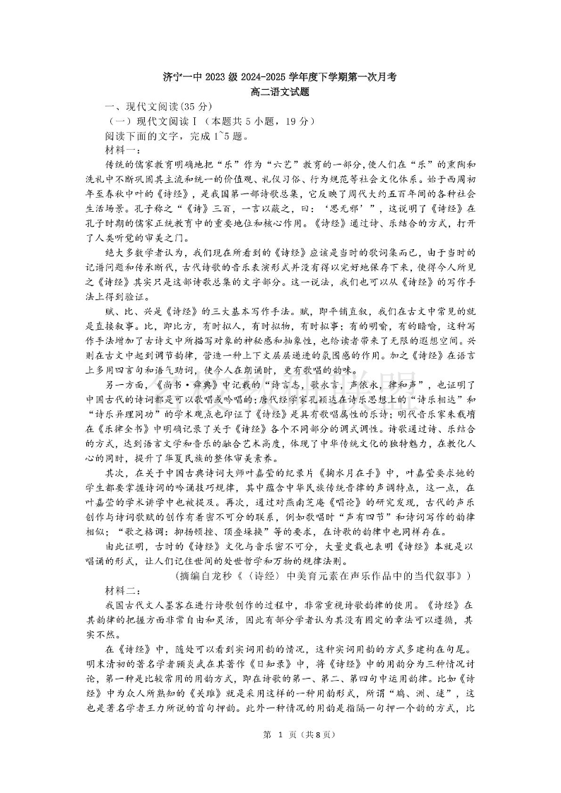 山东省济宁市第一中学2025年高二3月份月考 语文.pdf