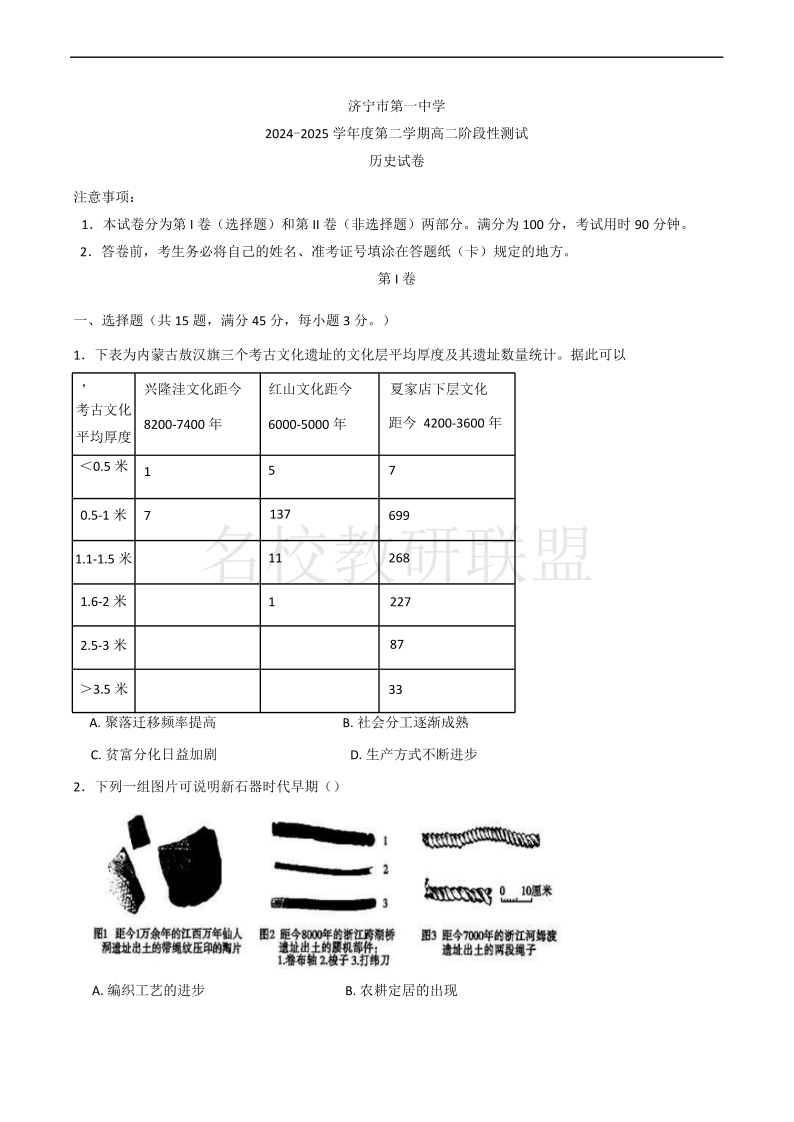 山东省济宁市第一中学2025年高二3月份月考 历史(含答案).pdf