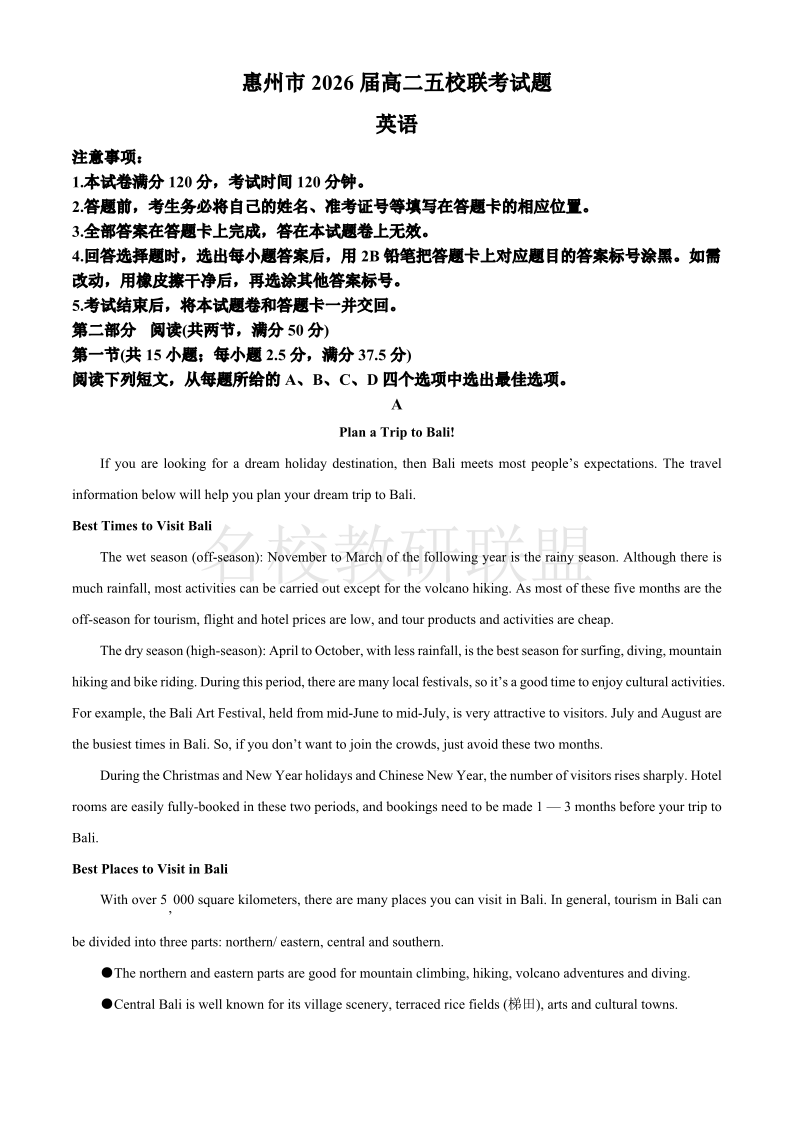 广东省惠州市2026届高二五校联考 英语(含答案).pdf