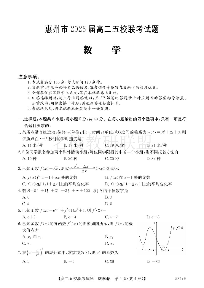 广东省惠州市2026届高二五校联考 数学(含答案).pdf