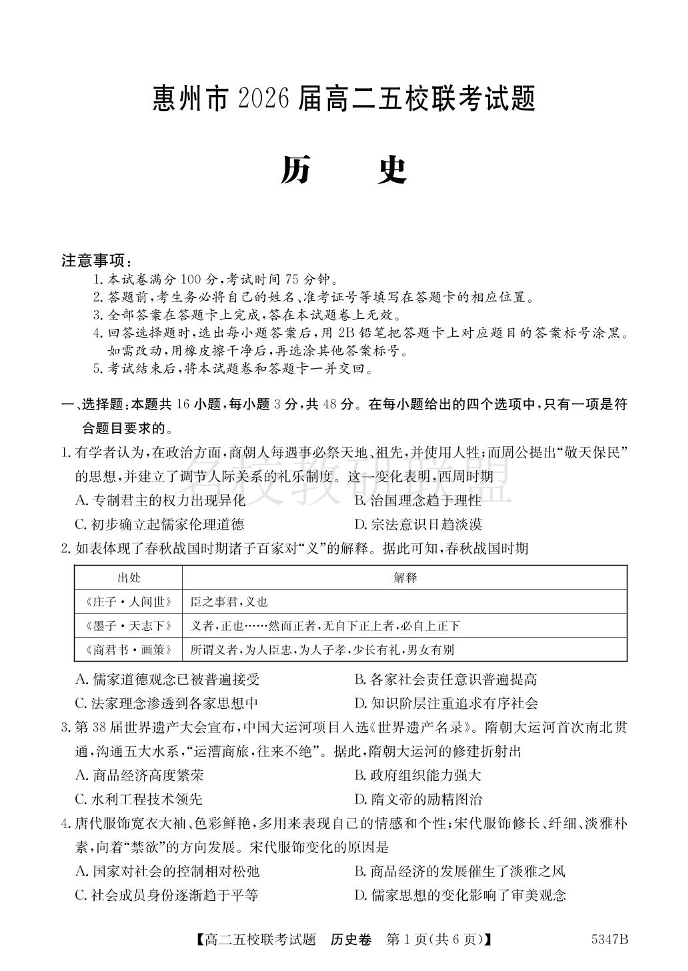 广东省惠州市2026届高二五校联考 历史(含答案).pdf