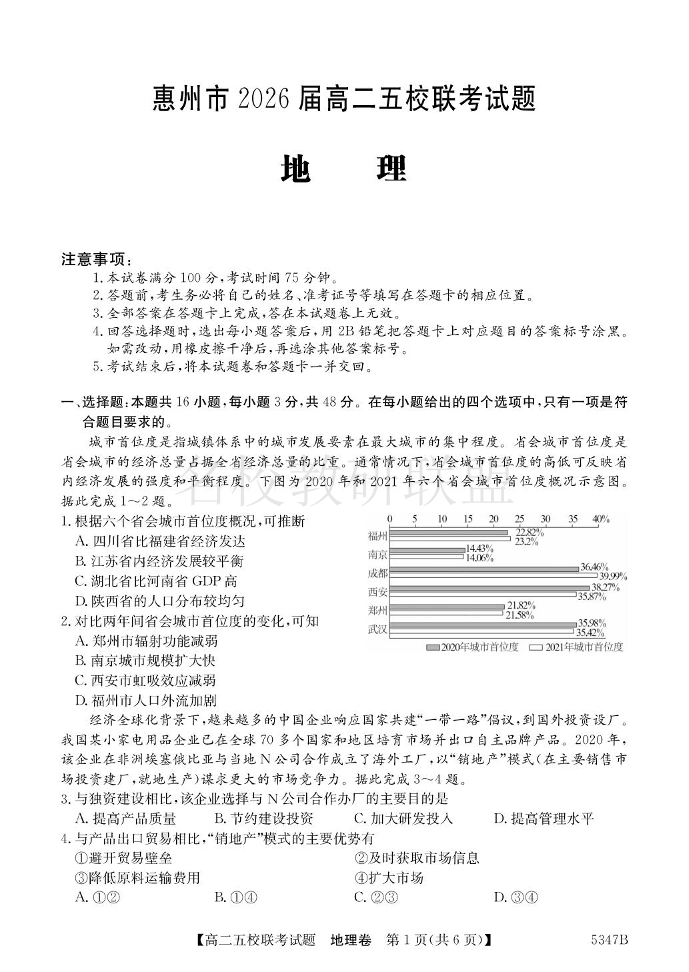 广东省惠州市2026届高二五校联考 地理(含答案).pdf