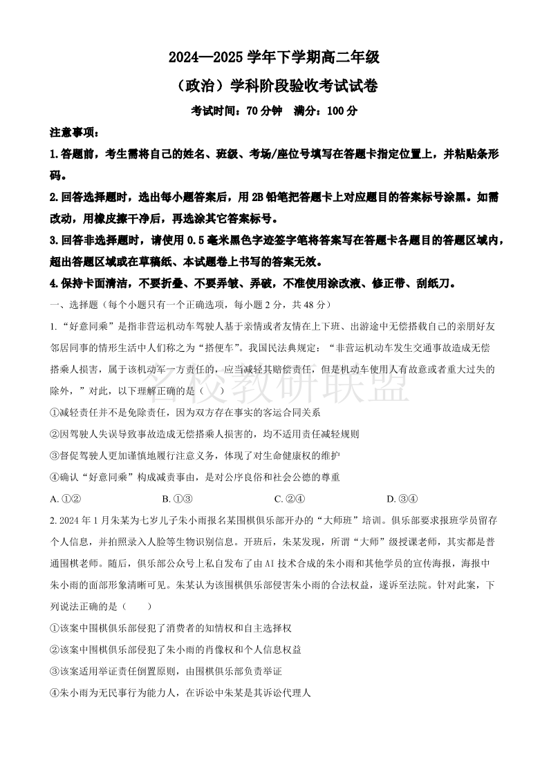东北师范大学附属中学2024-2025学年高二年级3月阶段验收考试 政治.pdf
