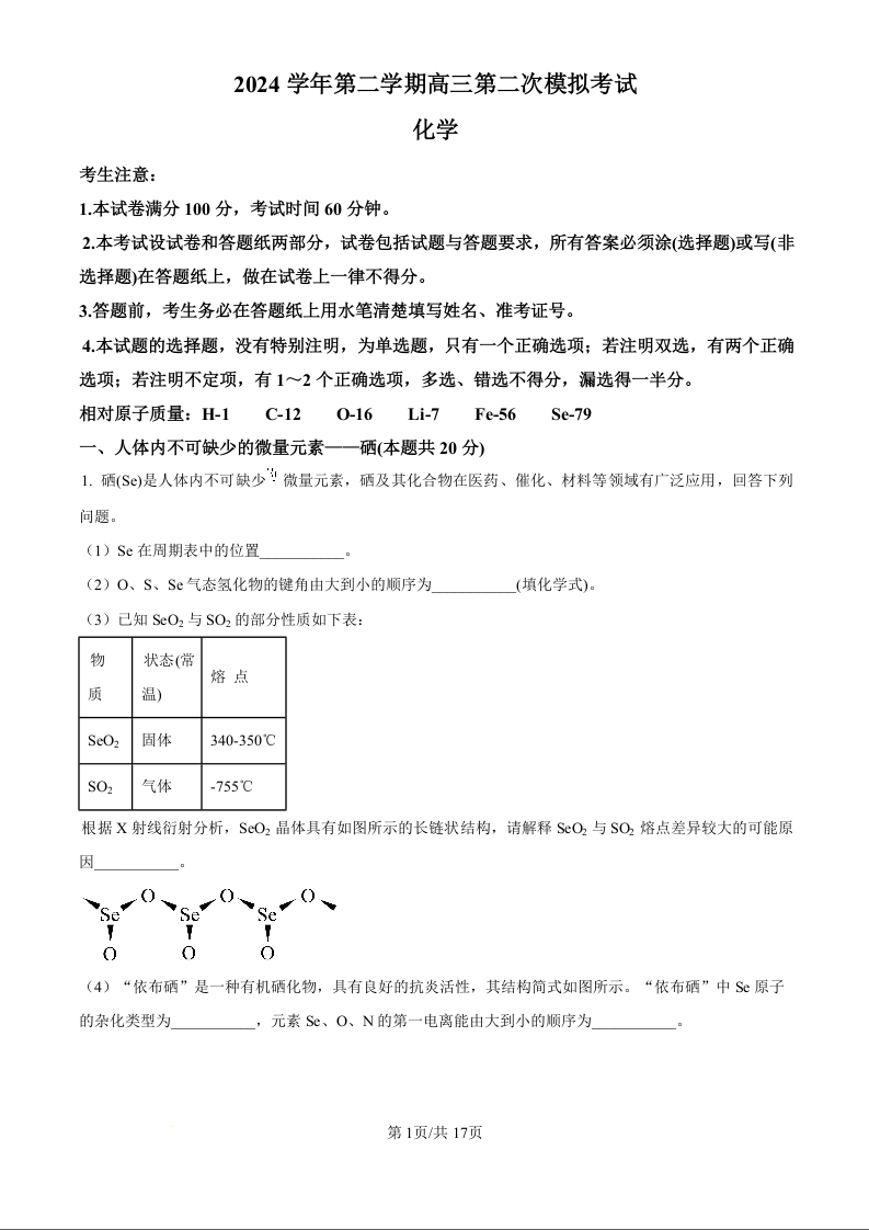 上海市崇明区2025届高三第二次模拟考试 化学答案.docx