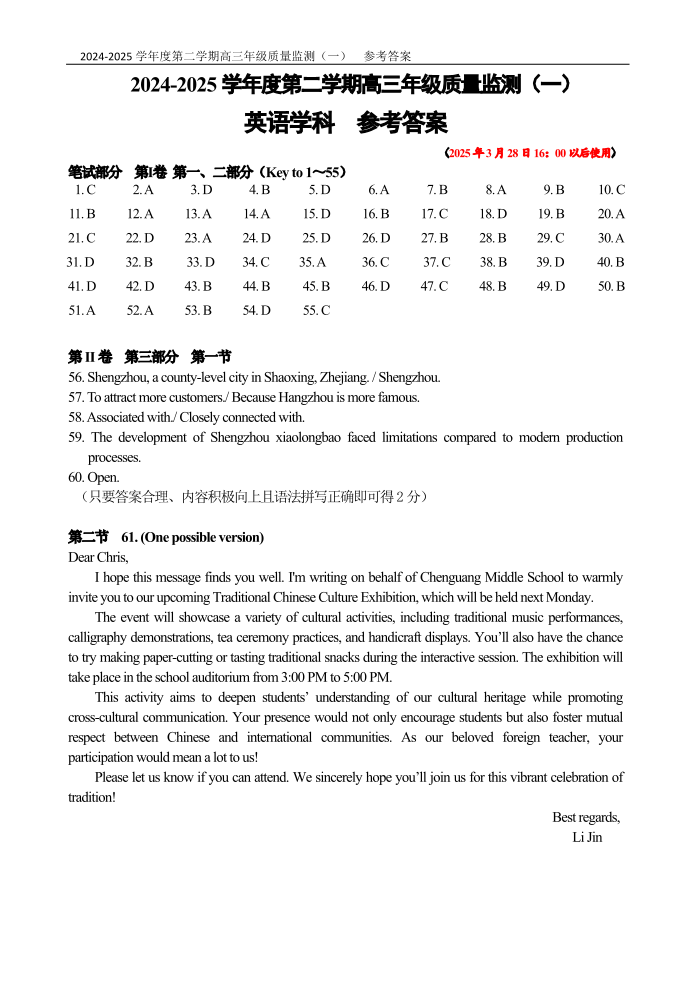 天津市南开区2024-2025学年度第二学期高三年级质量监测(一)英语答案.pdf