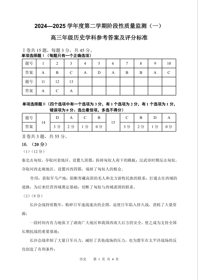 天津市南开区2024-2025学年度第二学期高三年级质量监测(一)历史答案.docx