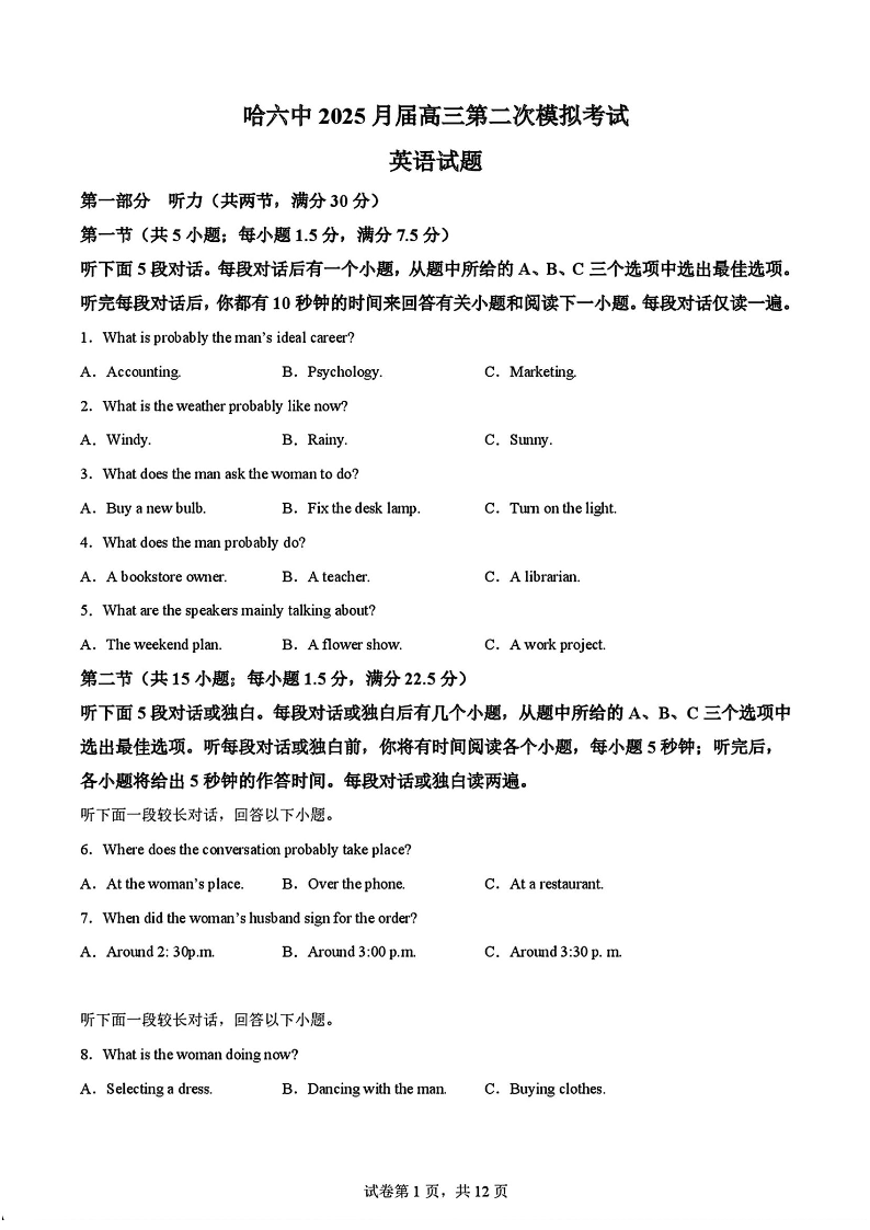 黑龙江省哈尔滨六中2025届高三第二次模拟考试 英语(含答案).pdf