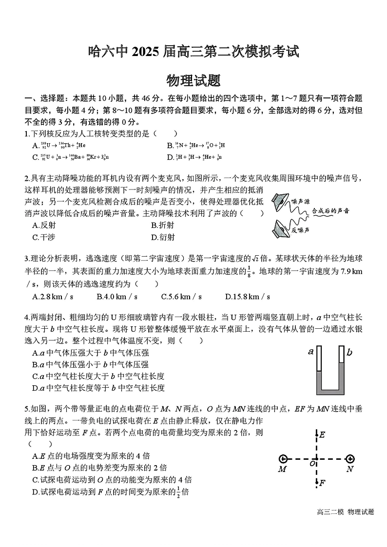 黑龙江省哈尔滨六中2025届高三第二次模拟考试 物理(含答案).pdf