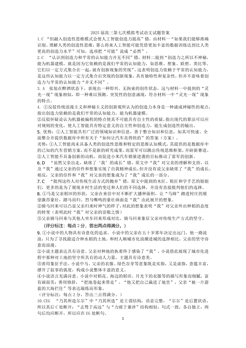 辽宁省本溪市高级中学2025届高三下学期第七次模拟考试 语文答案.pdf