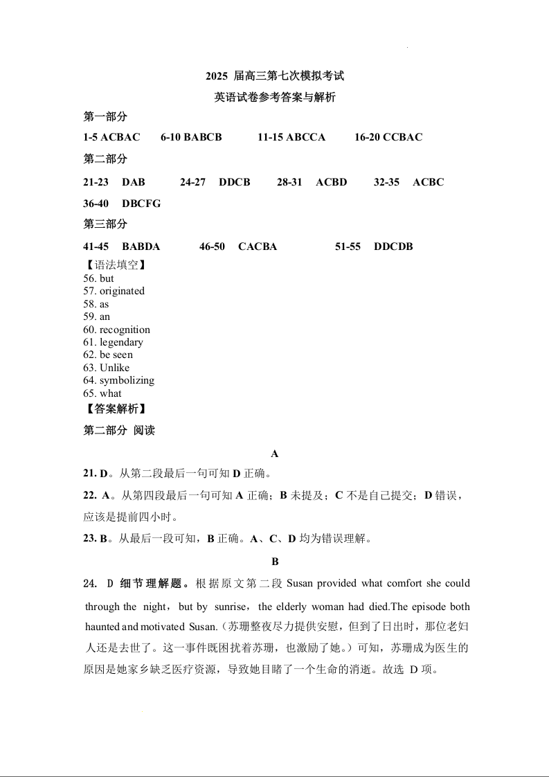 辽宁省本溪市高级中学2025届高三下学期第七次模拟考试 英语答案.docx