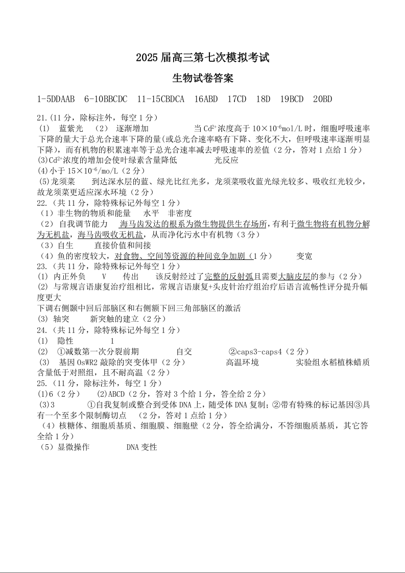 辽宁省本溪市高级中学2025届高三下学期第七次模拟考试 生物答案.docx