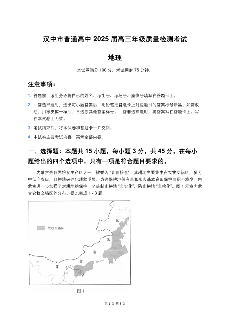 陕西省汉中市2025届高三年级质量检测考试(二模)地理(无答案).pdf