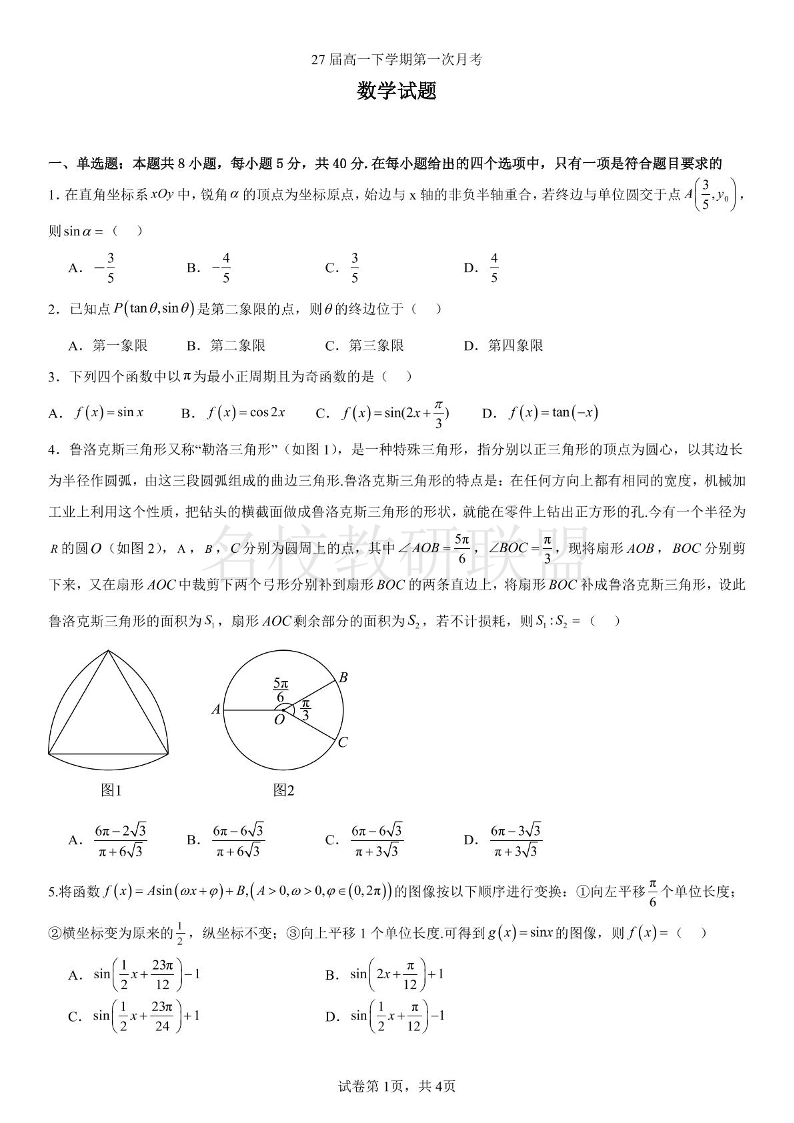 辽宁省实验中学2024-2025学年高一下学期4月阶段测试 数学(含答案).pdf