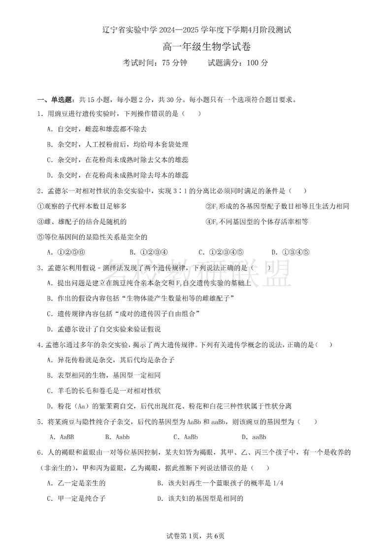 辽宁省实验中学2024-2025学年高一下学期4月阶段测试 生物(含答案).pdf