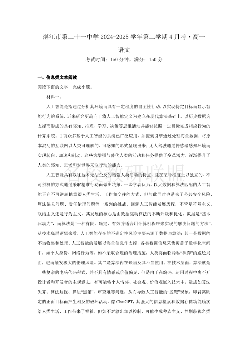 广东省湛江市第二十一中学2024-2025学年高一下学期4月月考 语文.pdf