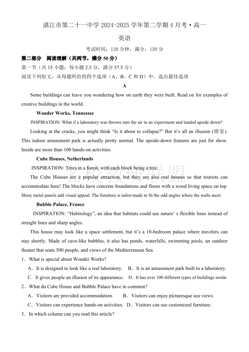 广东省湛江市第二十一中学2024-2025学年高一下学期4月月考 英语.pdf