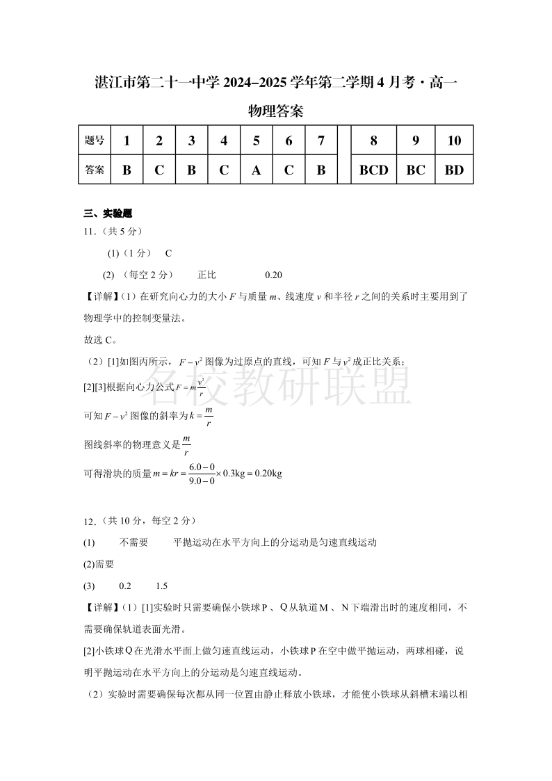 广东省湛江市第二十一中学2024-2025学年高一下学期4月月考 物理答案.pdf