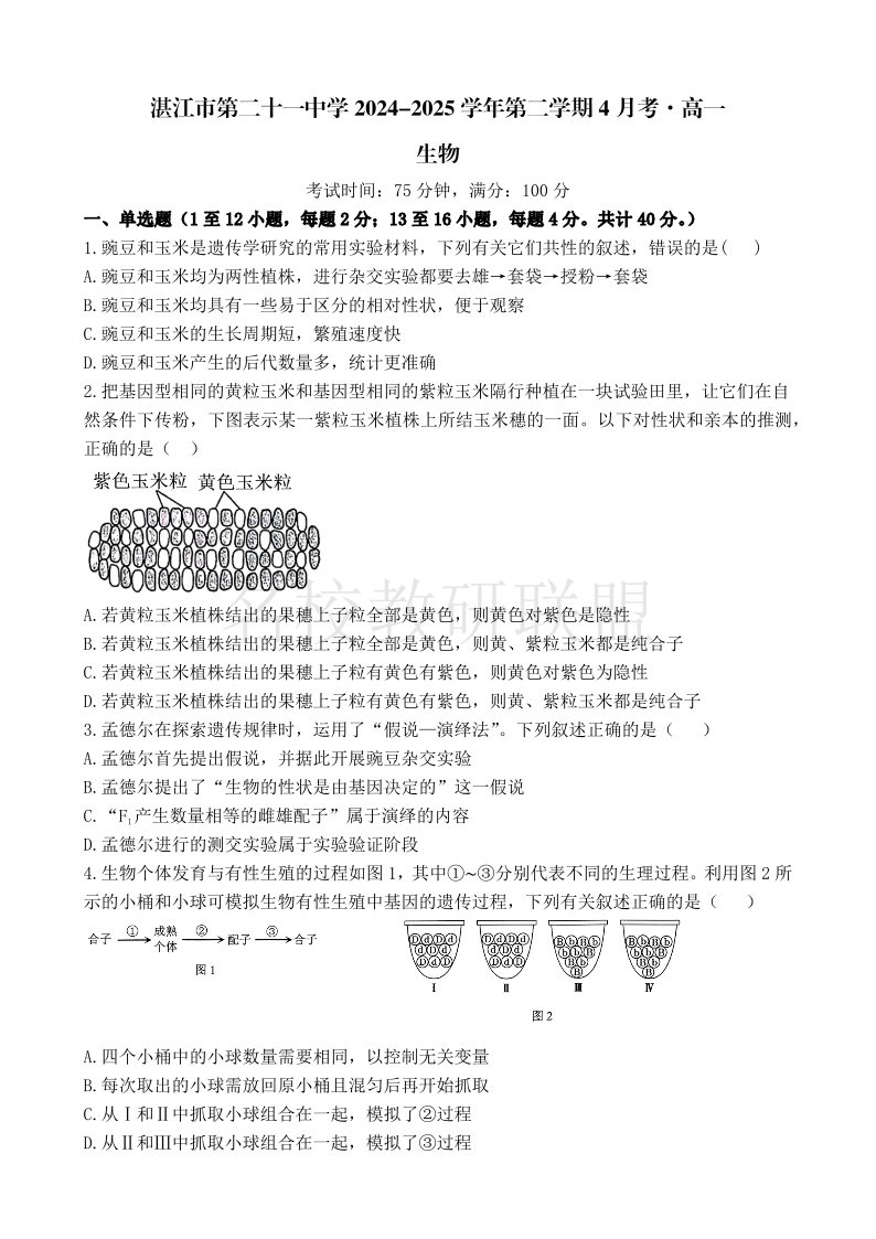 广东省湛江市第二十一中学2024-2025学年高一下学期4月月考 生物.pdf