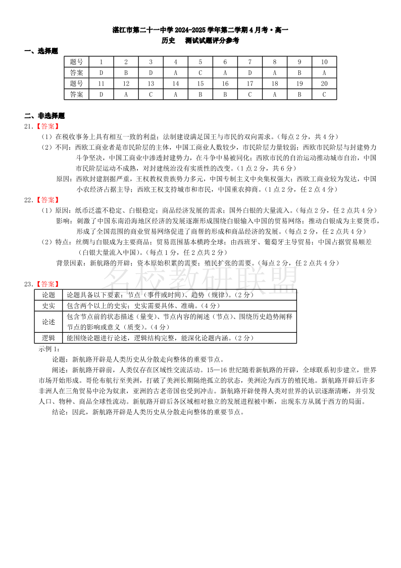 广东省湛江市第二十一中学2024-2025学年高一下学期4月月考 历史答案.pdf