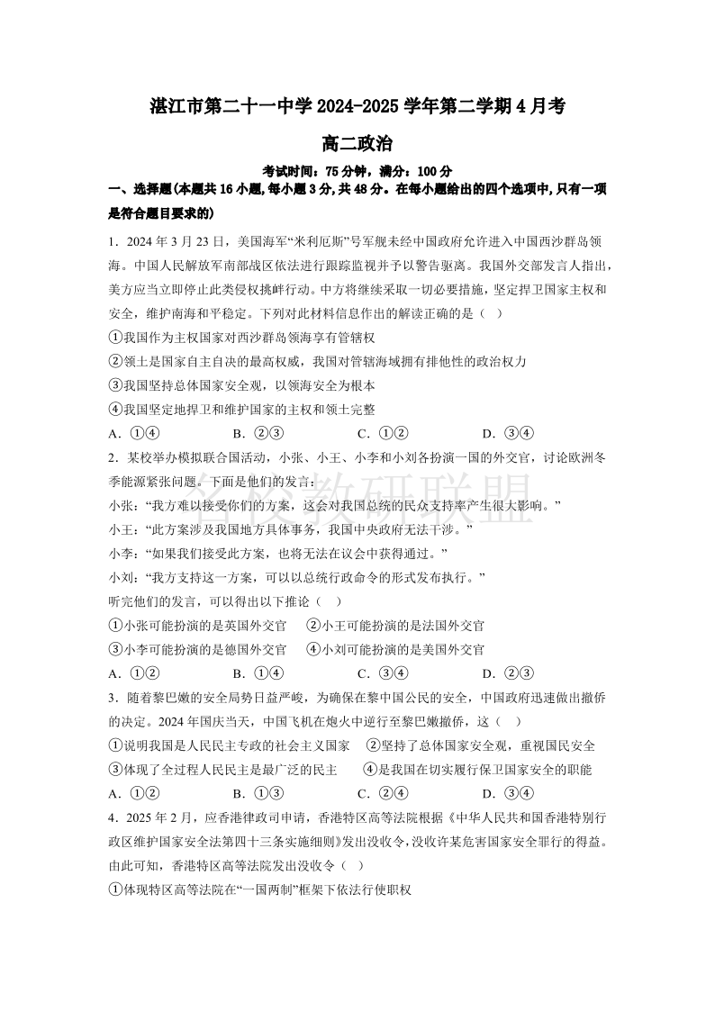 广东省湛江市第二十一中学2024-2025学年高二下学期4月月考 政治.pdf