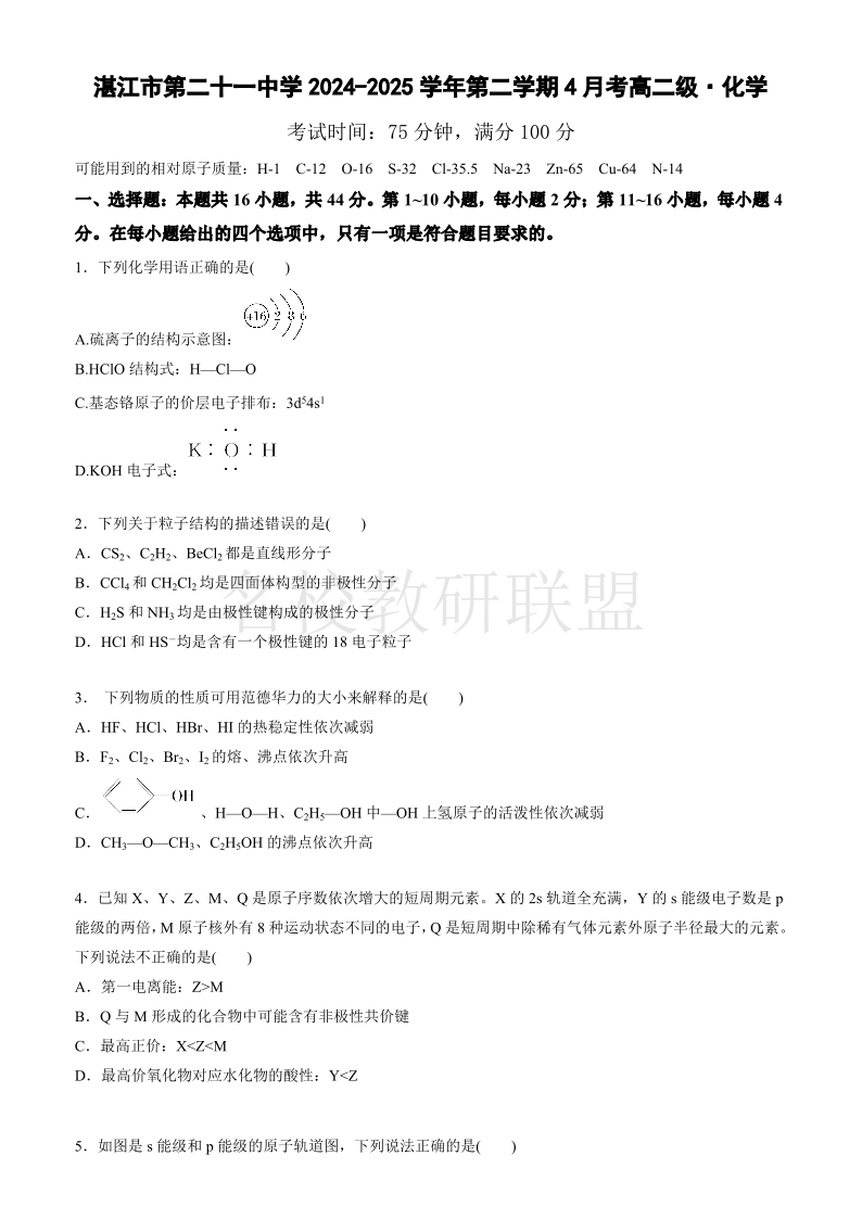 广东省湛江市第二十一中学2024-2025学年高二下学期4月月考 化学.pdf