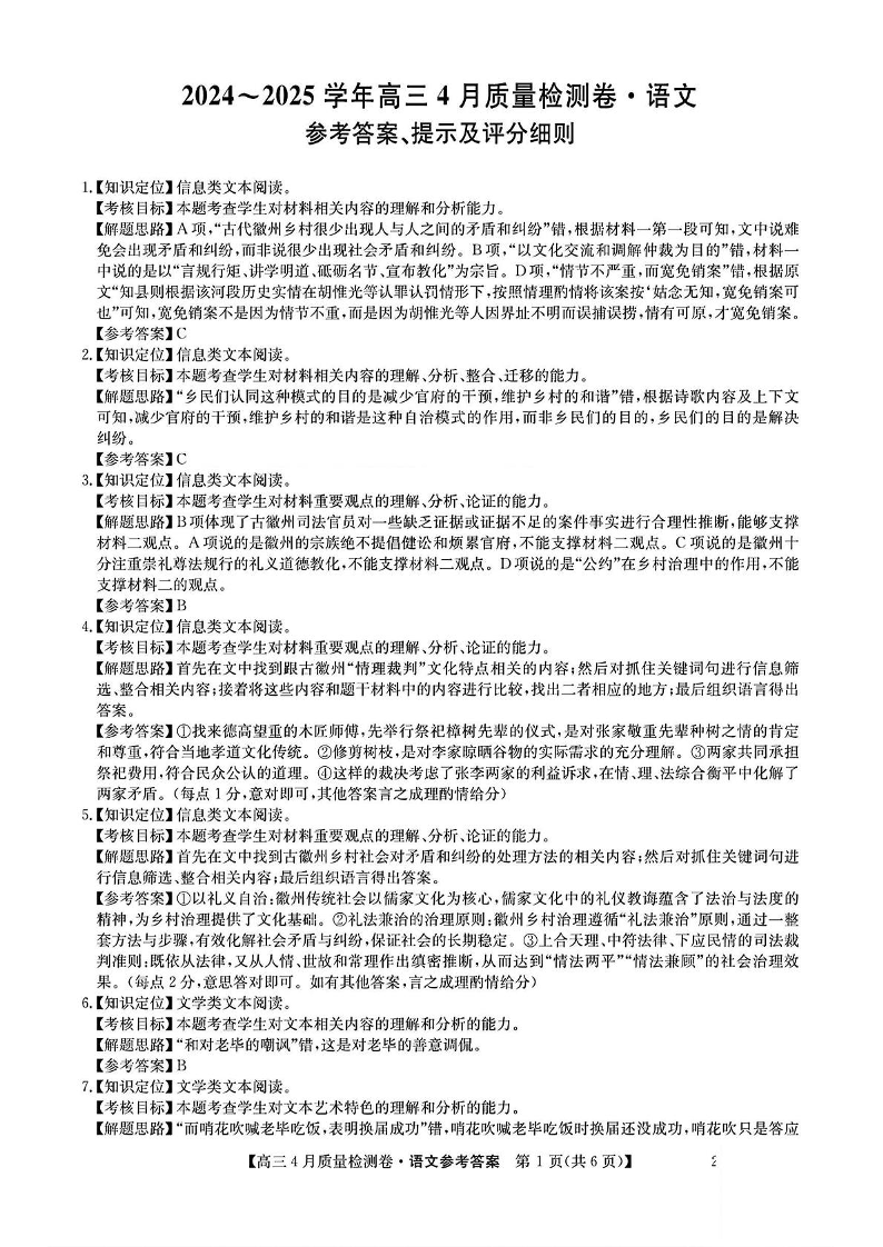 山西省三晋卓越联盟2025届高三4月质量检测卷 语文答案.pdf