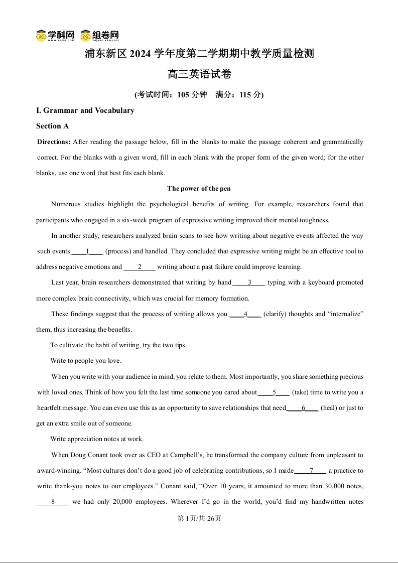 上海市浦东新区2024学年度第二学期高中教学质量检测 英语答案.docx