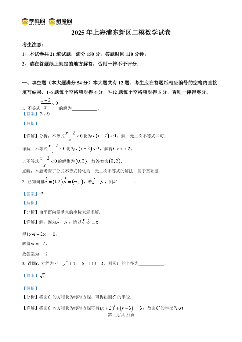 上海市浦东新区2024学年度第二学期高中教学质量检测 数学答案.docx