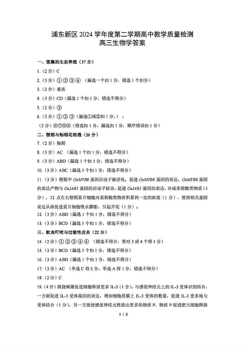 上海市浦东新区2024学年度第二学期高中教学质量检测 生物答案.pdf