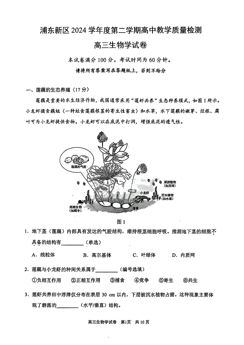 上海市浦东新区2024学年度第二学期高中教学质量检测 生物.pdf