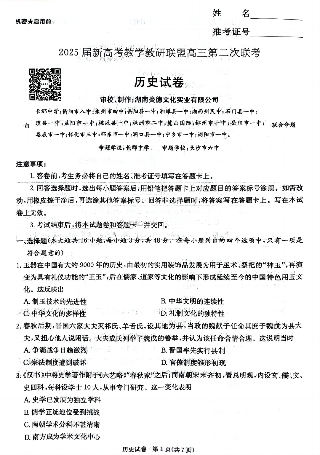 湖南新高考教学教研联盟2025届高三年级第二次联考 历史.pdf